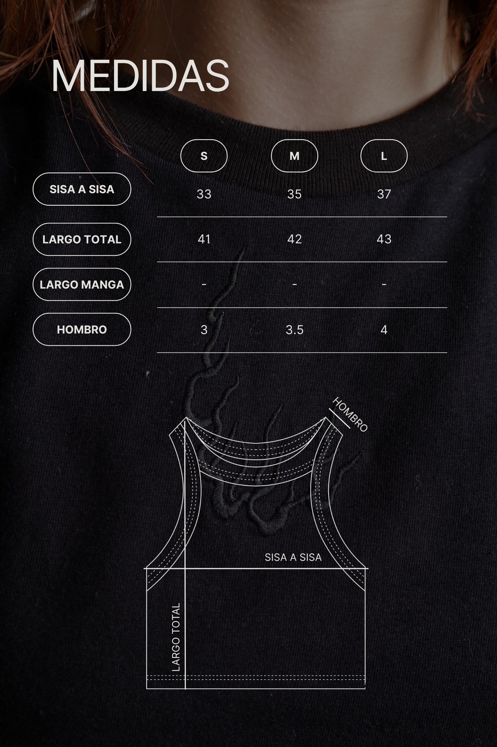 Musculosa corta de morley con cuello redondo. Collareta ancha en sisa y cuello, con bordado exclusivo. Calce Crop.
