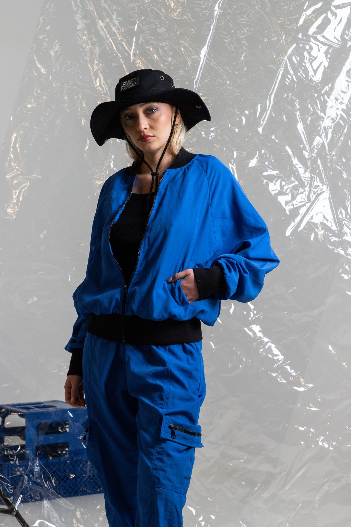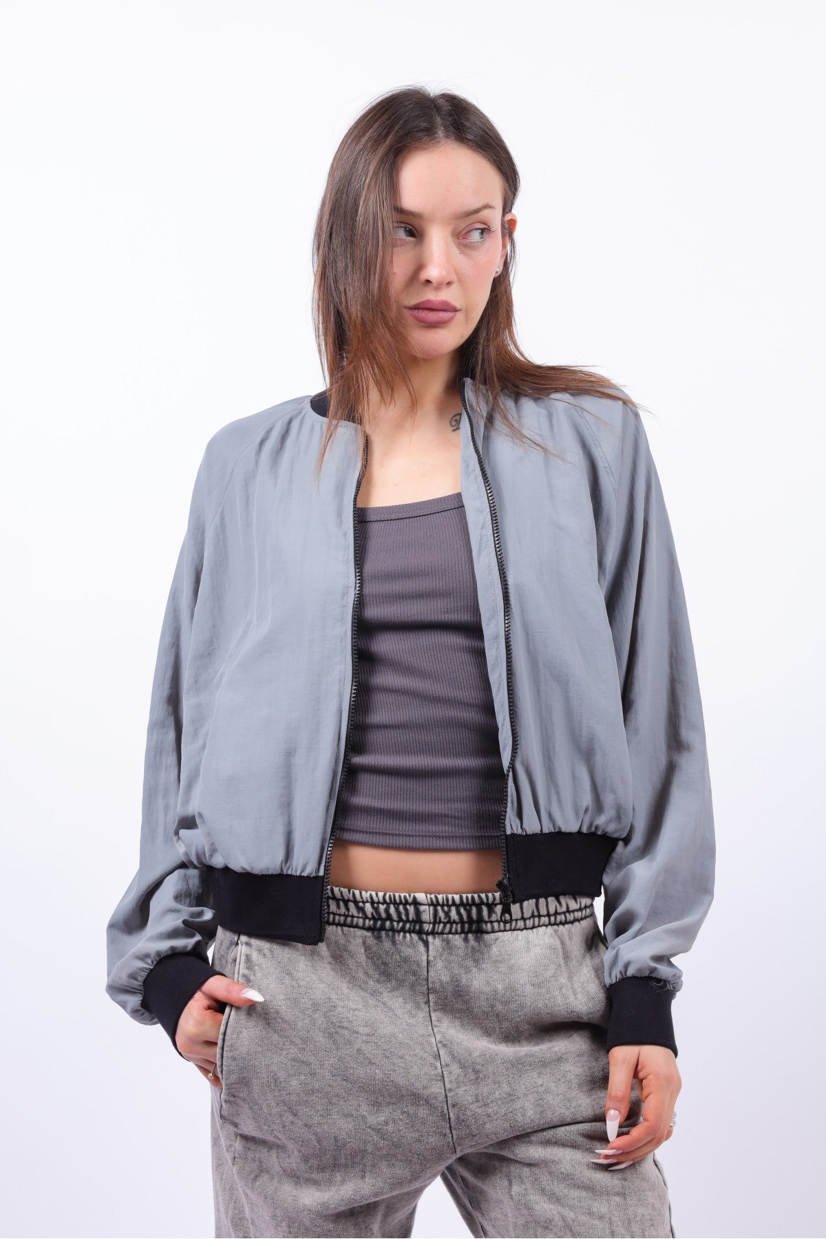 Campera corte bomber de nylon semipermeable con bolsillo ribete en delantero. Puños y cuello tejido en negro. Cierre diente de perro. Calce Regular
