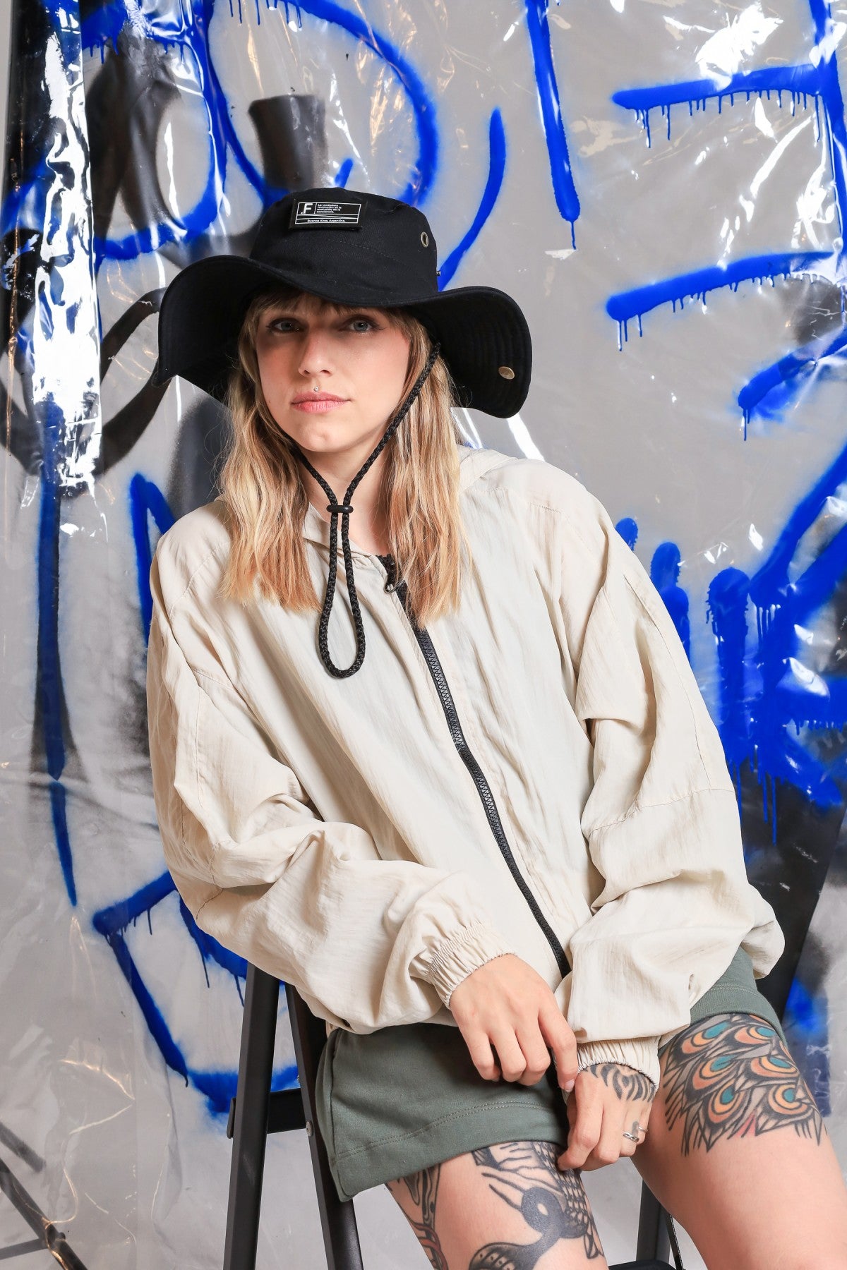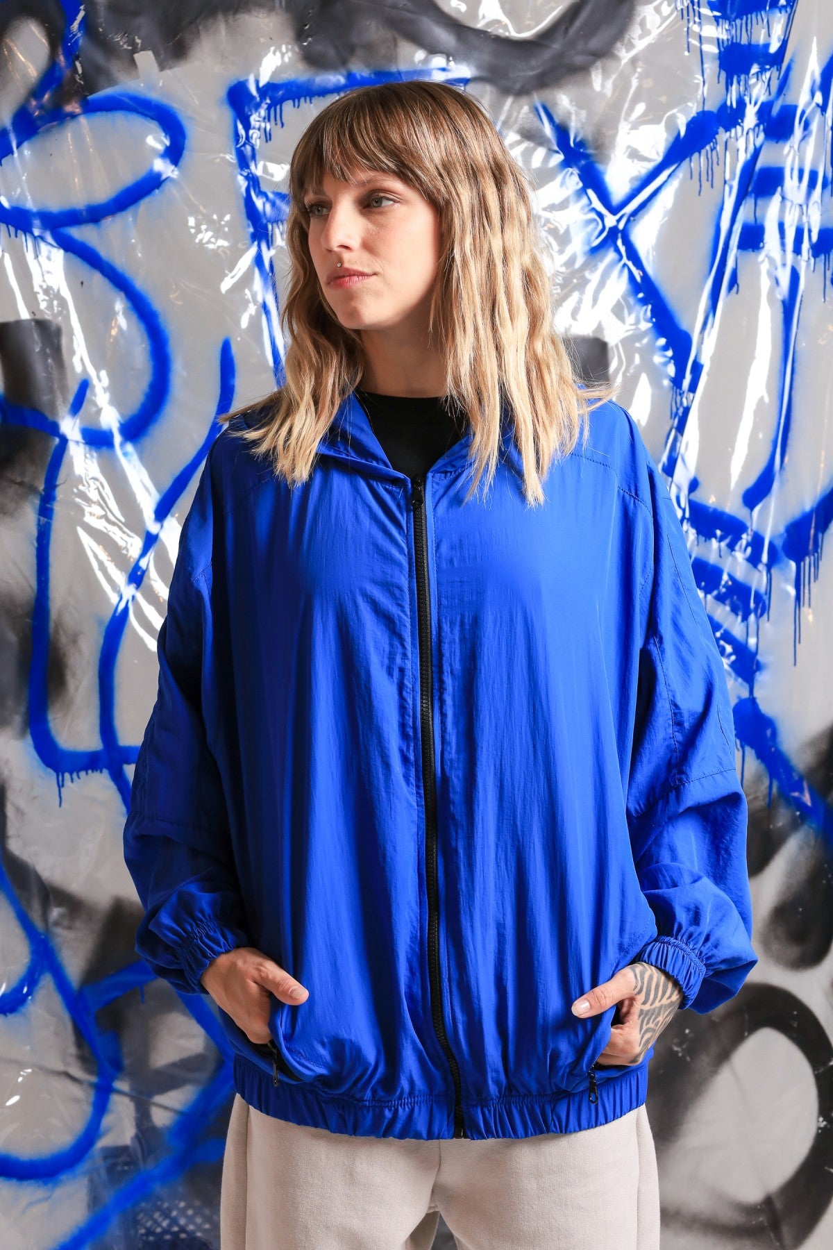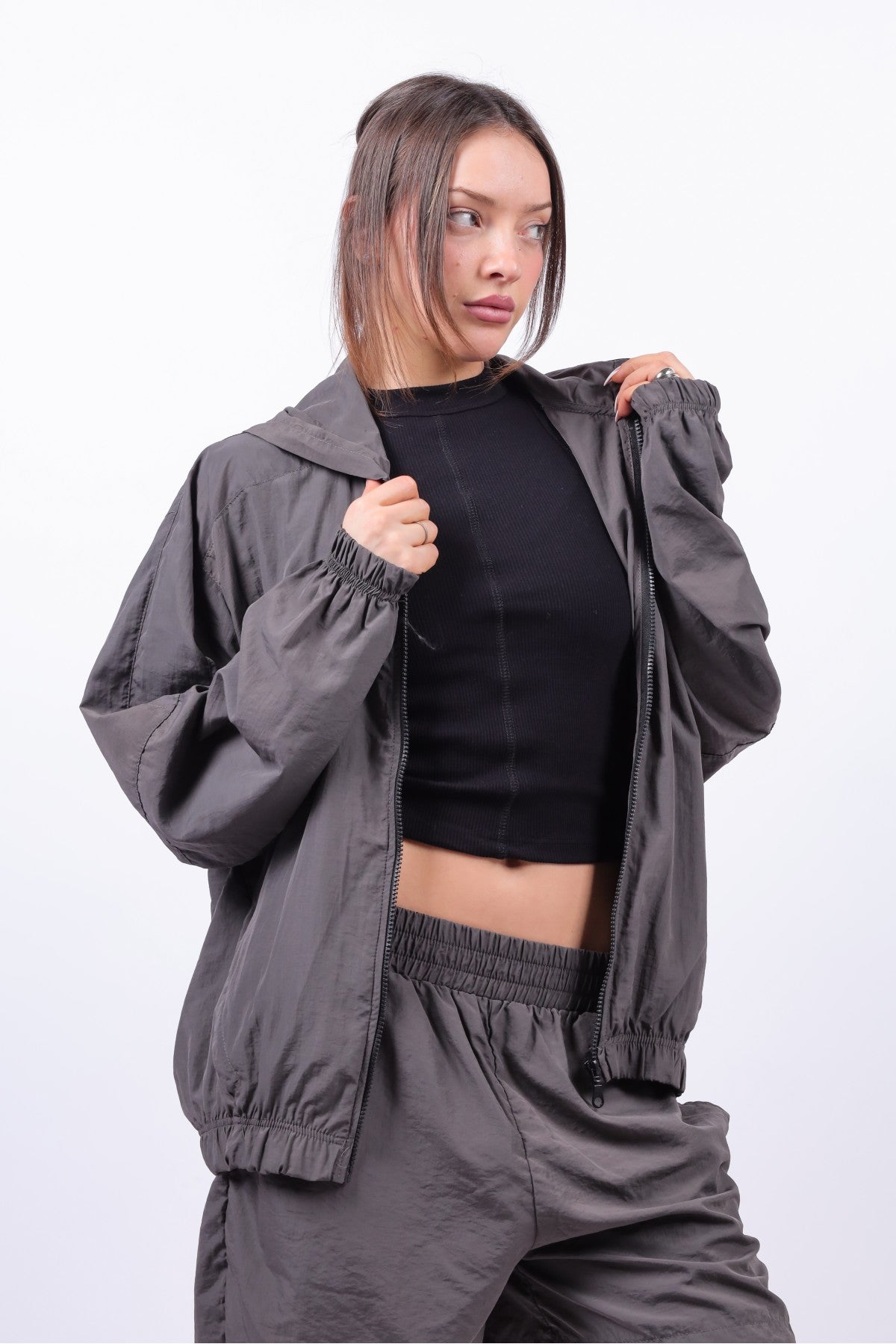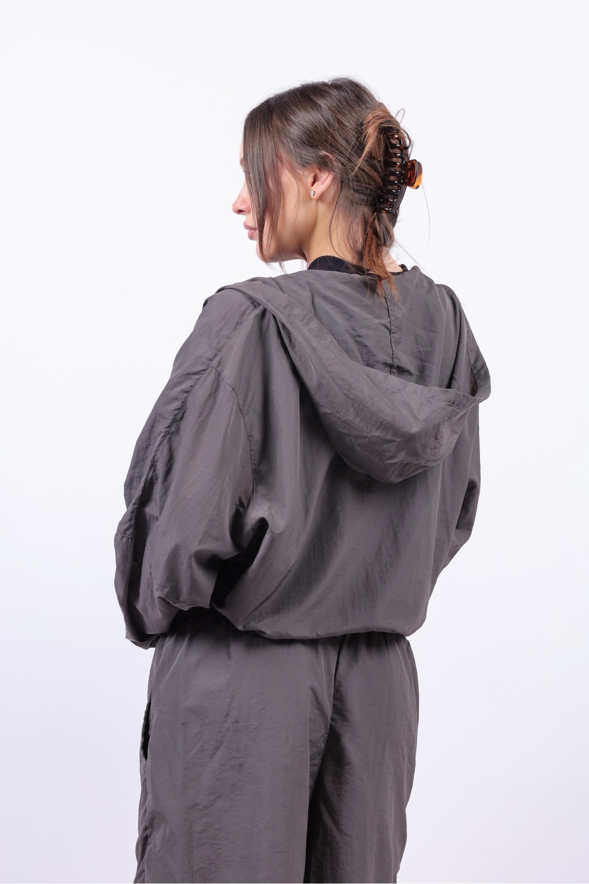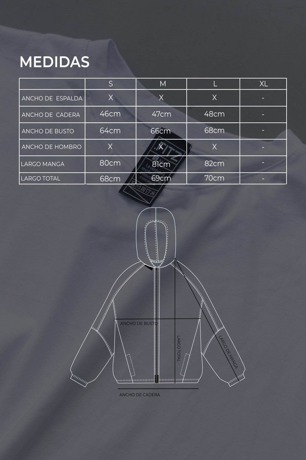 Campera de nylon semipermeable con recorte y bolsillos laterales en delantero con cierre, y capucha. Cierre diente de perro. Calce Regular. Composicion: 100% Nylon