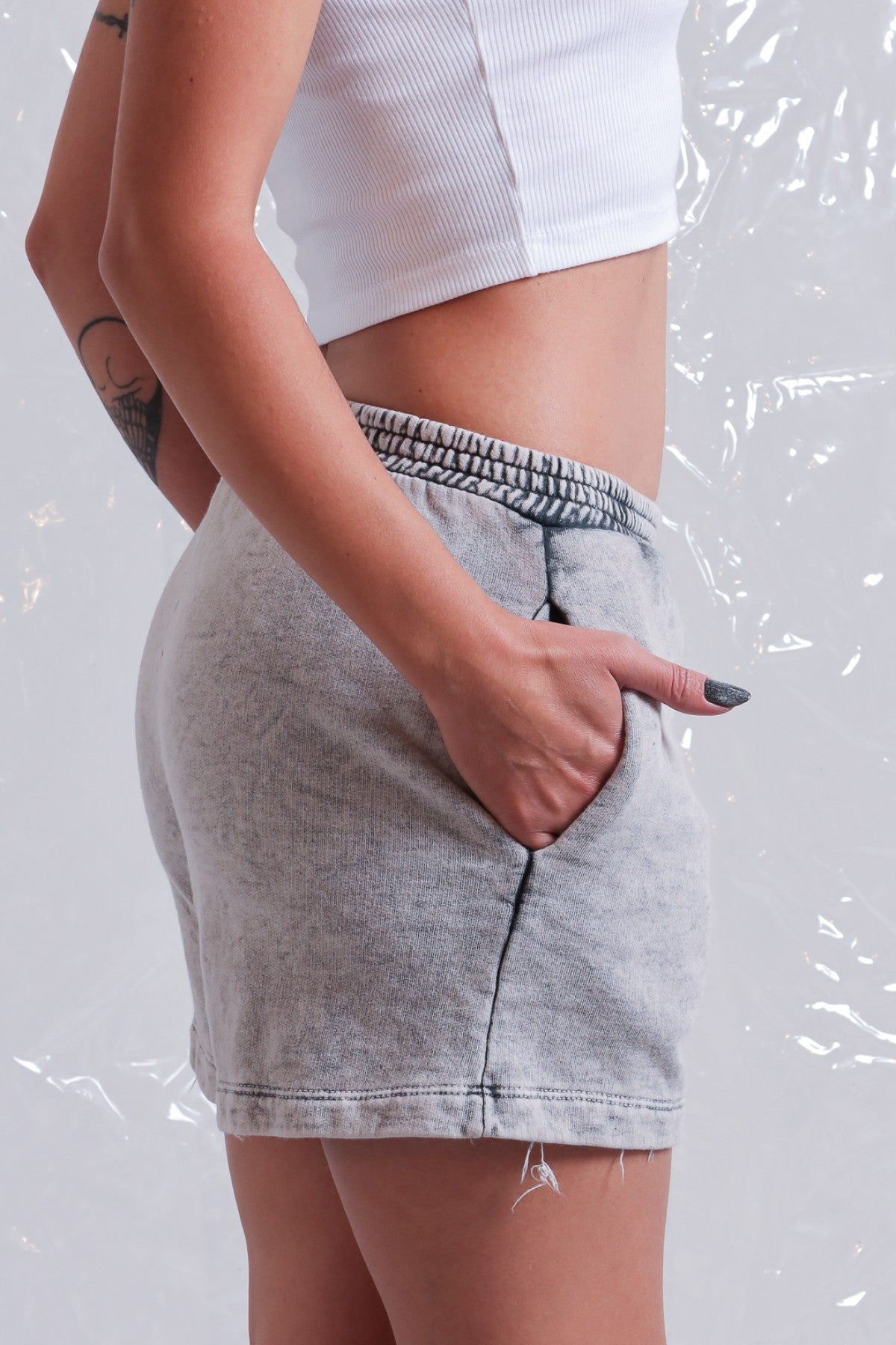 Short de rústico, con cintura elastizada y bolsillos. Esta prenda lleva un proceso artesanal de lavado acid, puede variar levemente en cada prenda.