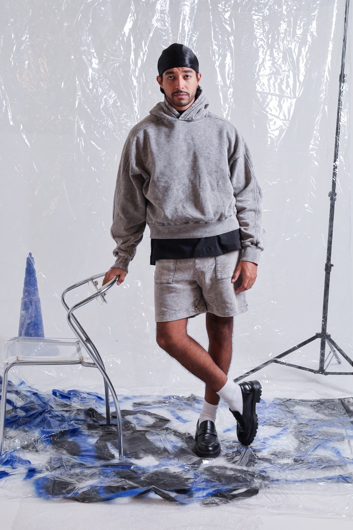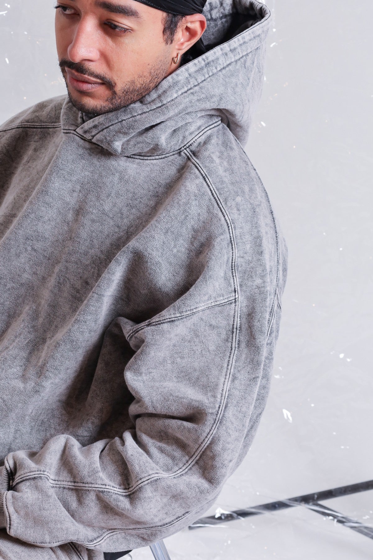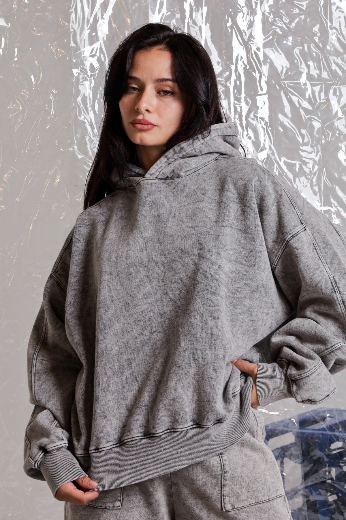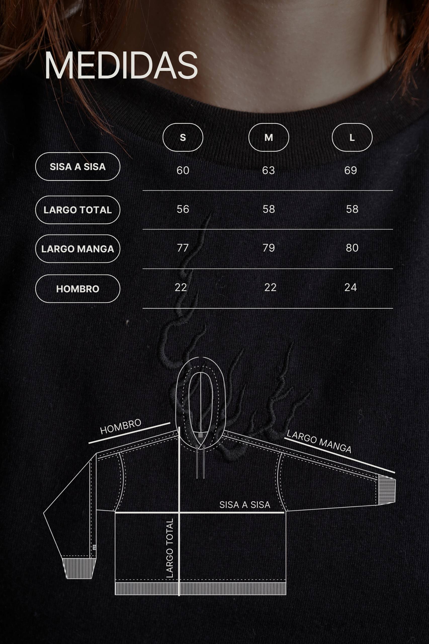 Buzo de frisa con capucha y recortes en la manga, con puños de ribb. Calce Boxy. Esta prenda lleva un proceso artesanal de lavado acid, puede variar levemente en cada prenda.
