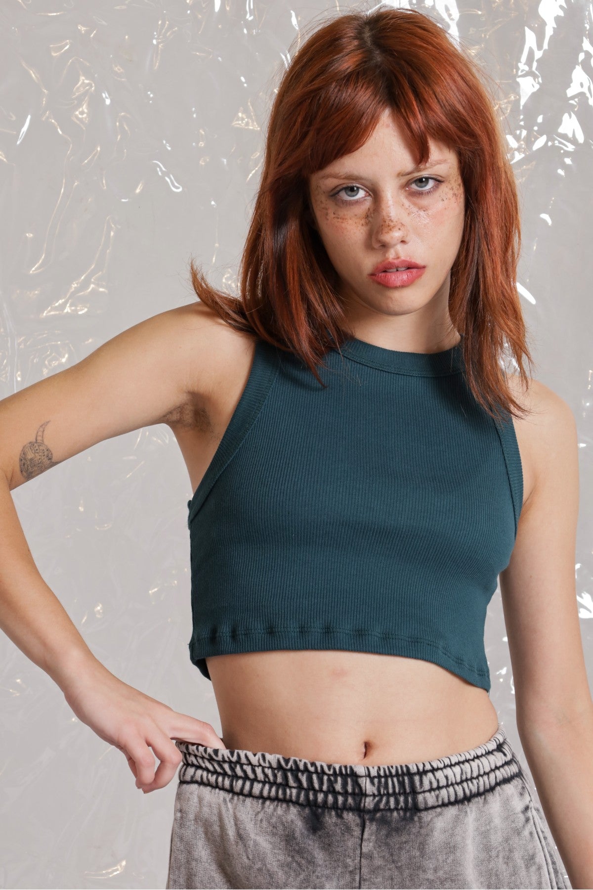 Musculosa básica de morley con cuello halter. Collareta sisa y cuello. Calce Crop. Composición: 100% Algodón