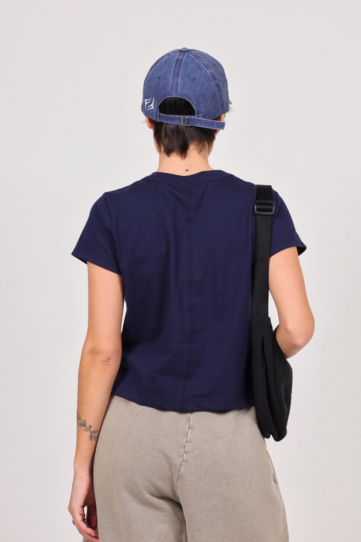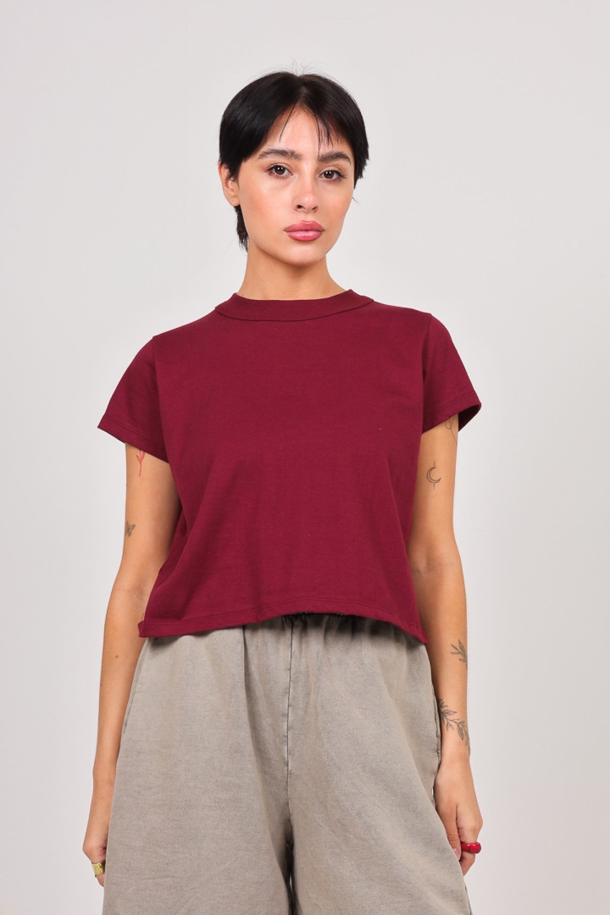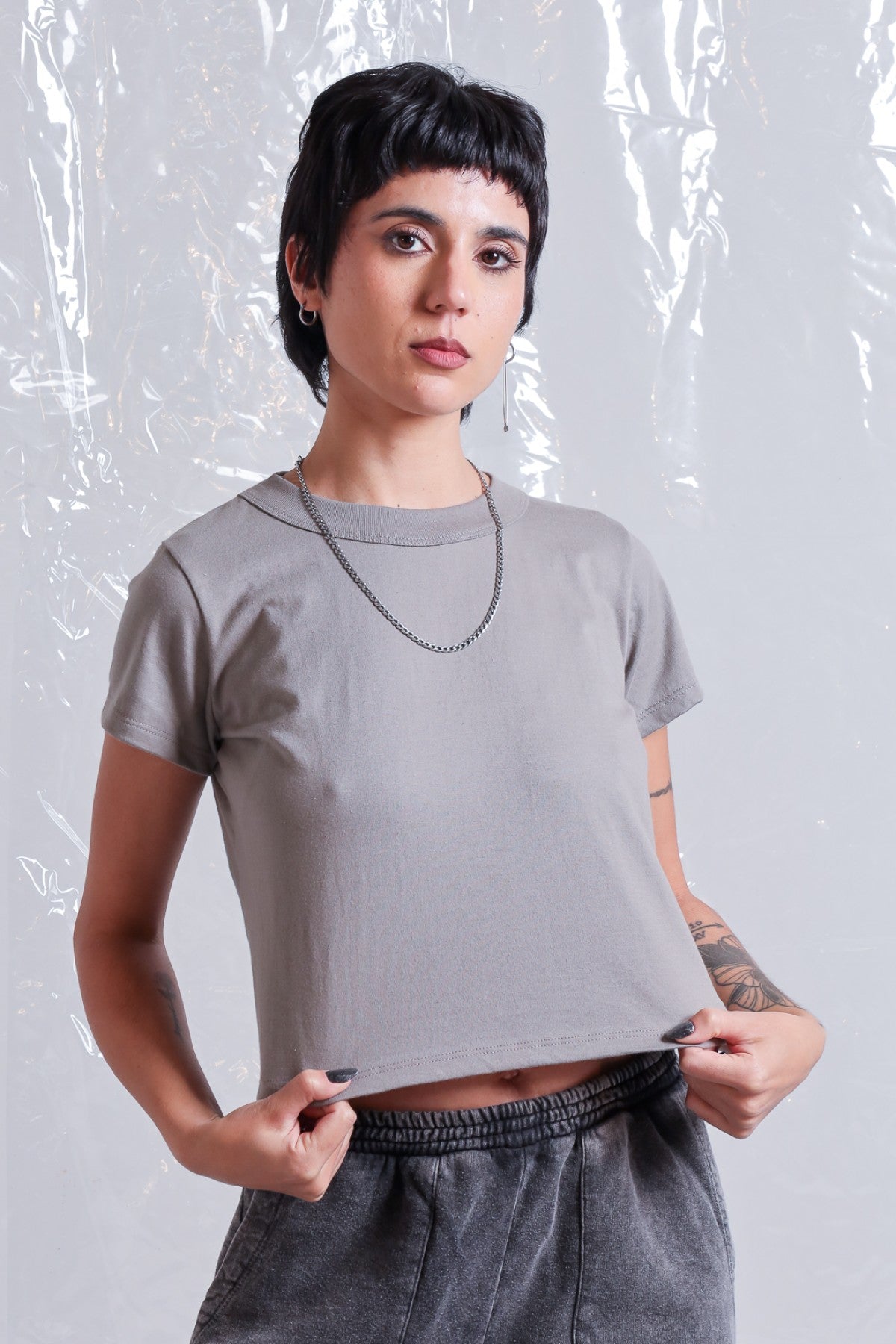 Remera de jersey pesado manga corta con cuello redondo de ribb y espalda partida con bordadora. Calce Crop.