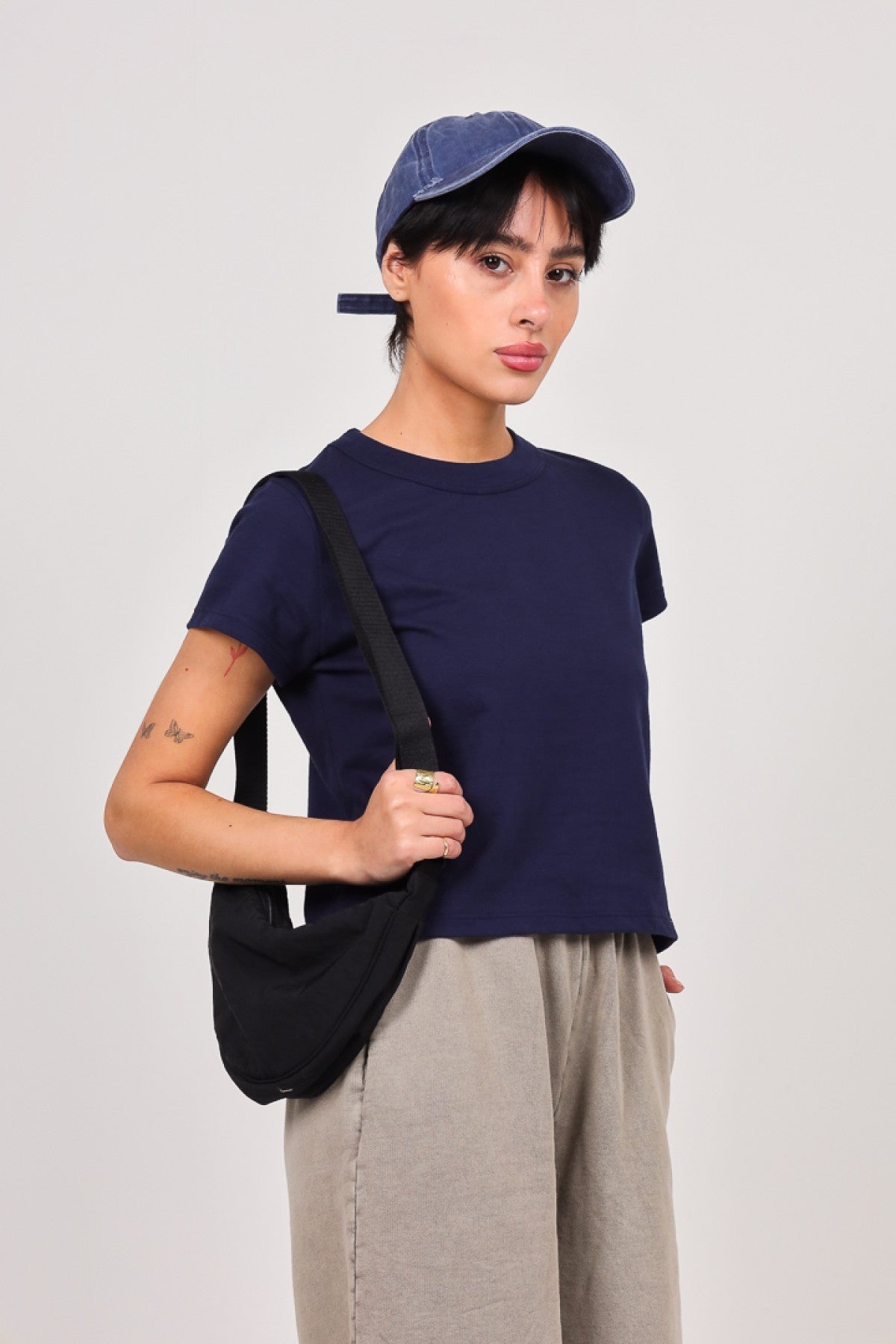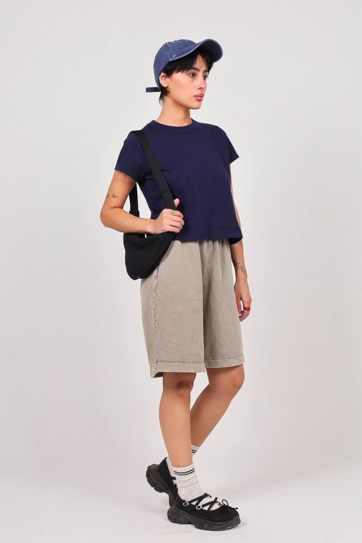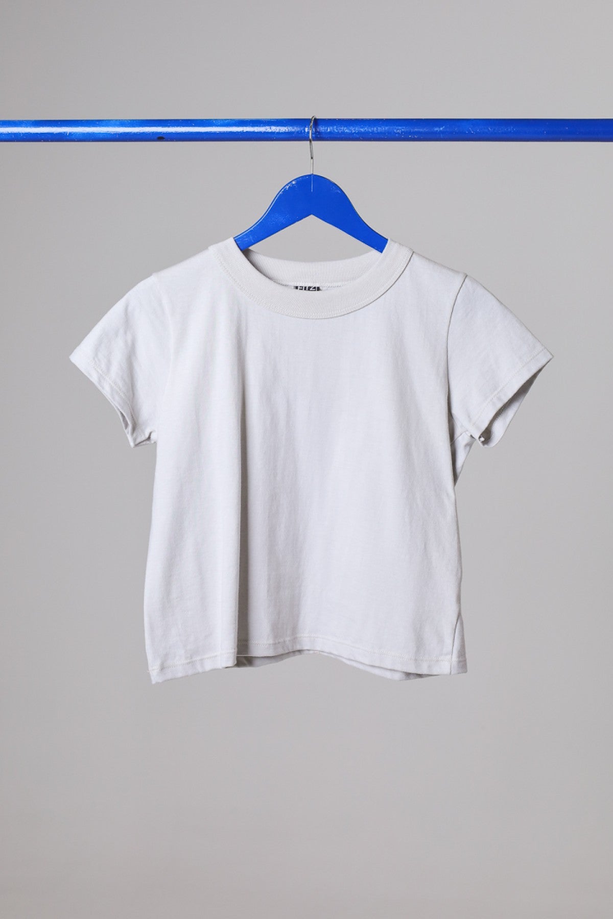 Remera de jersey pesado manga corta con cuello redondo de ribb y espalda partida con bordadora. Calce Crop.