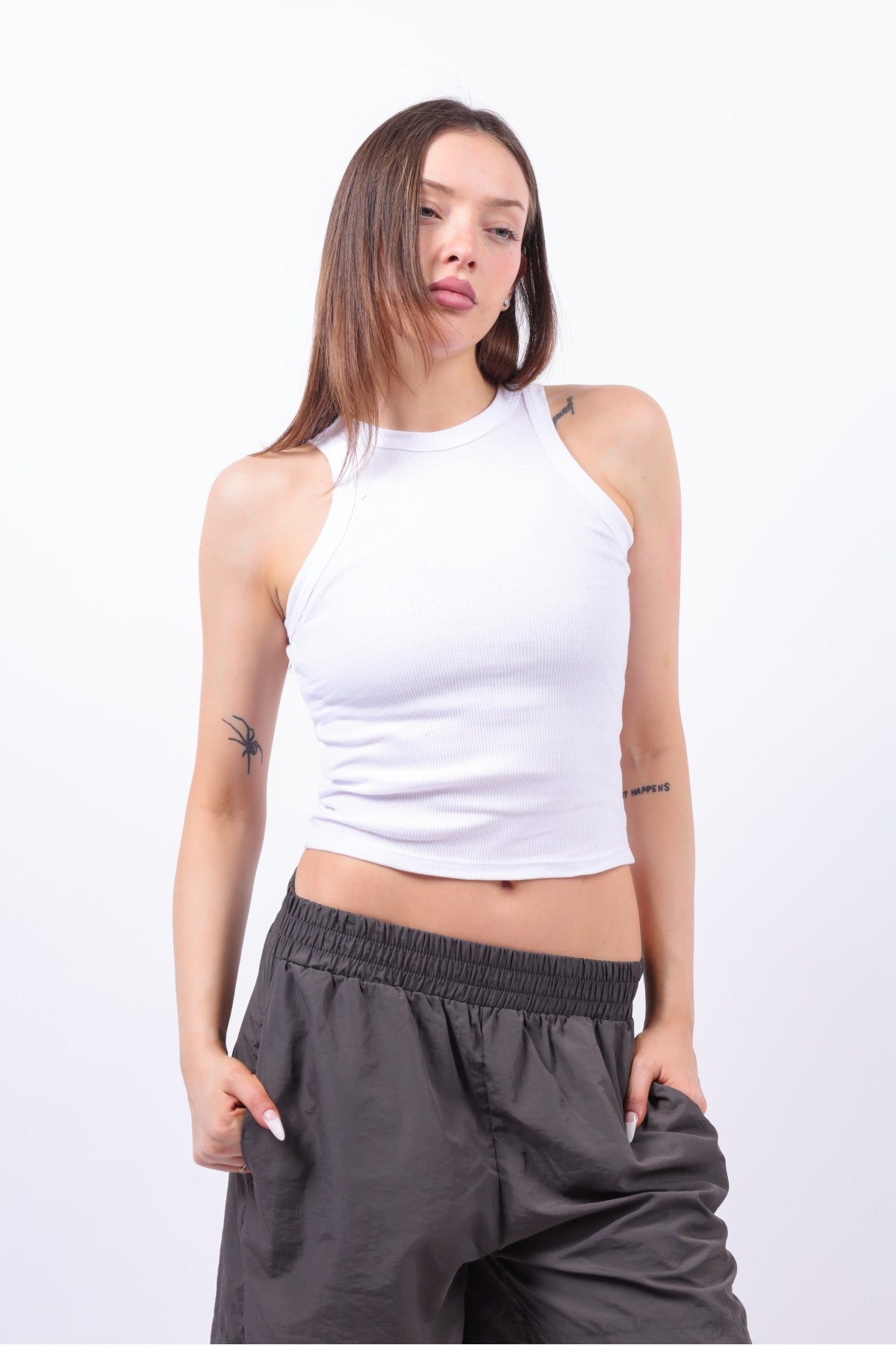 Musculosa básica de morley con cuello halter. Collareta sisa y cuello. Calce Regular. Composición: 100% Algodón