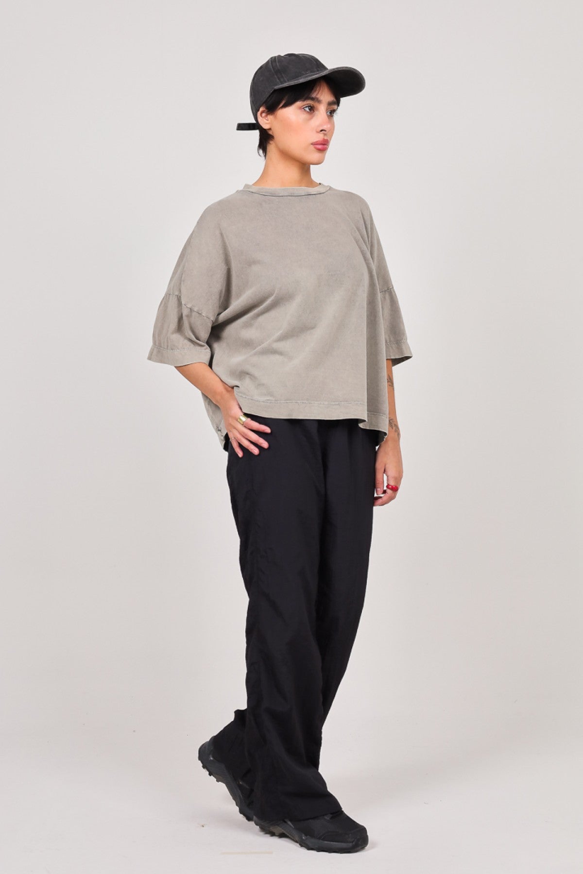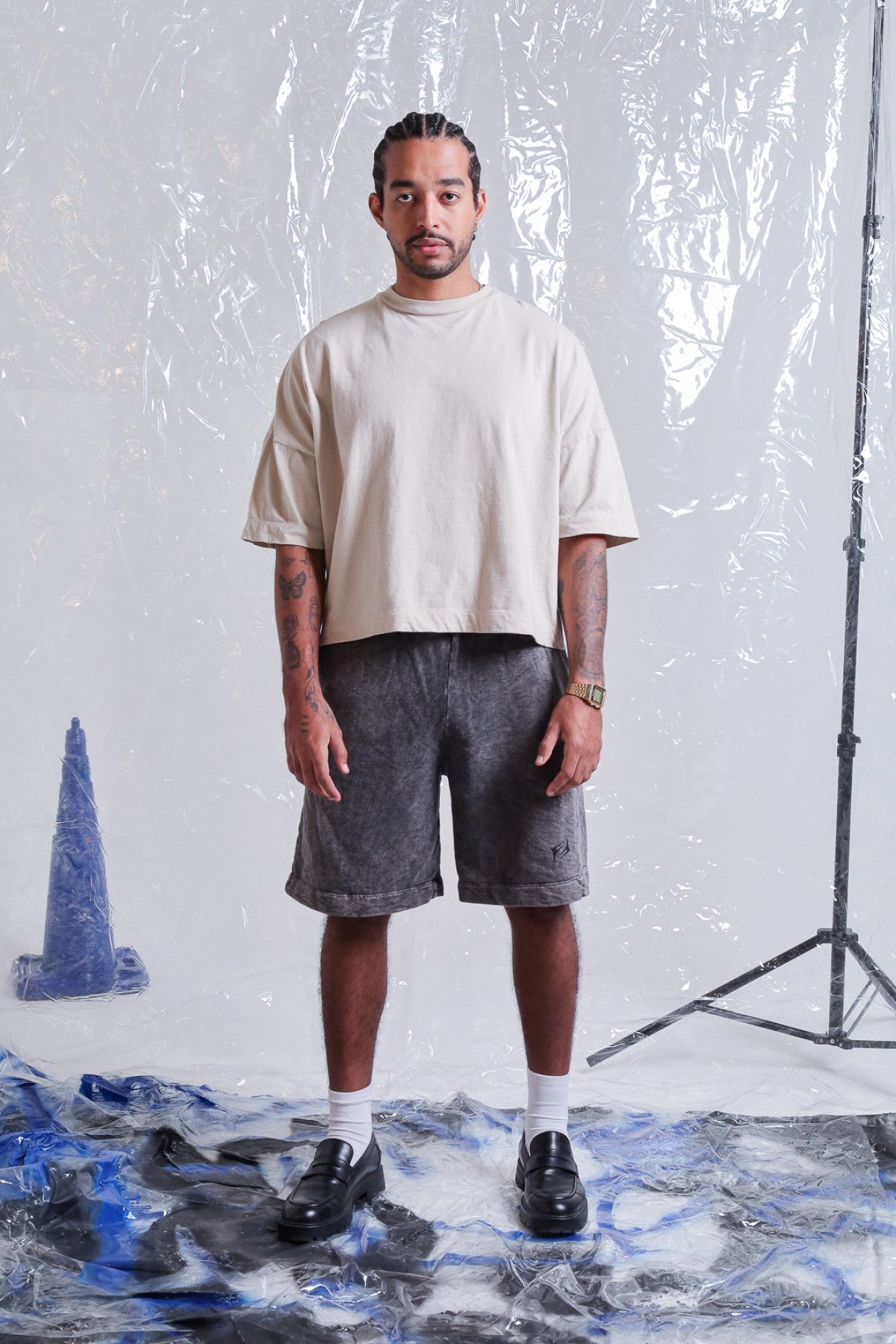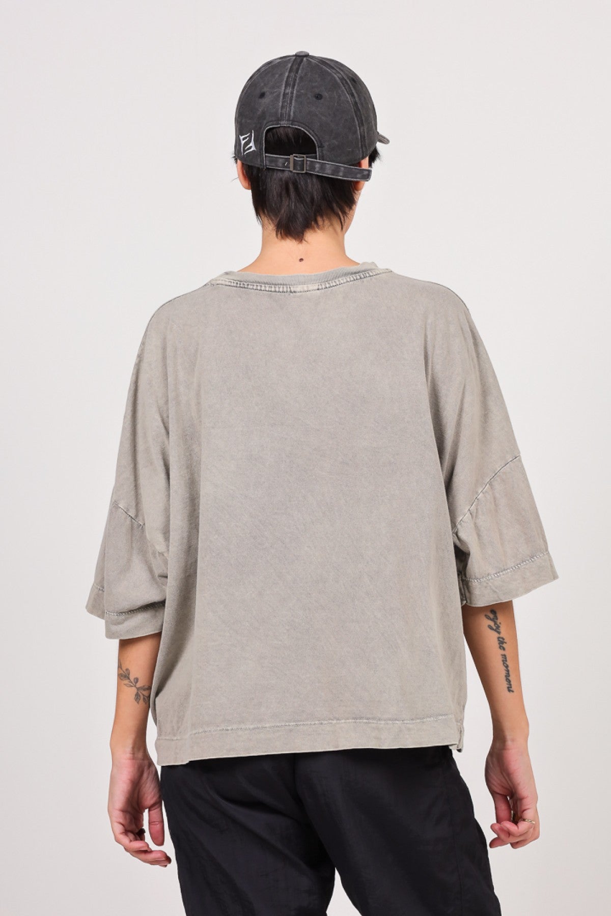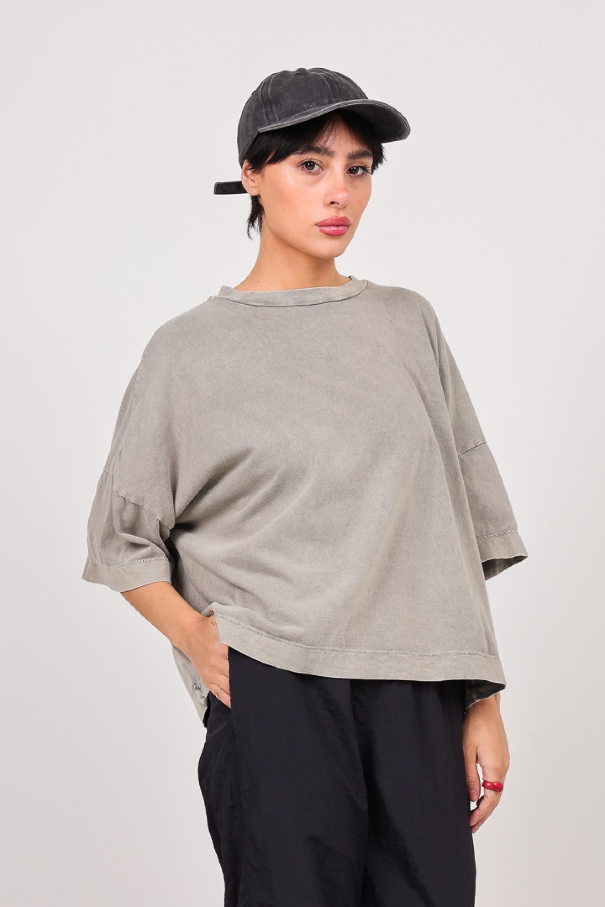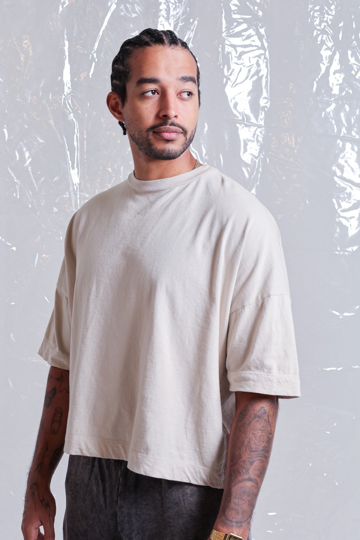 Remera lisa de jersey pesado manga corta con cuello redondo de ribb. Calce Boxy. Esta prenda lleva un proceso artesanal de lavado acid, puede variar levemente en cada prenda.