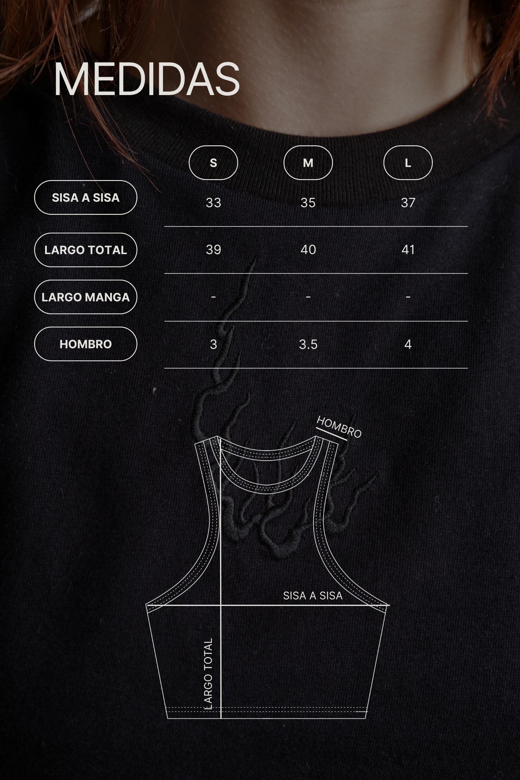Musculosa corta de morley con cuello redondo. Collareta en sisa y cuello, con bordado exclusivo. Calce Crop.