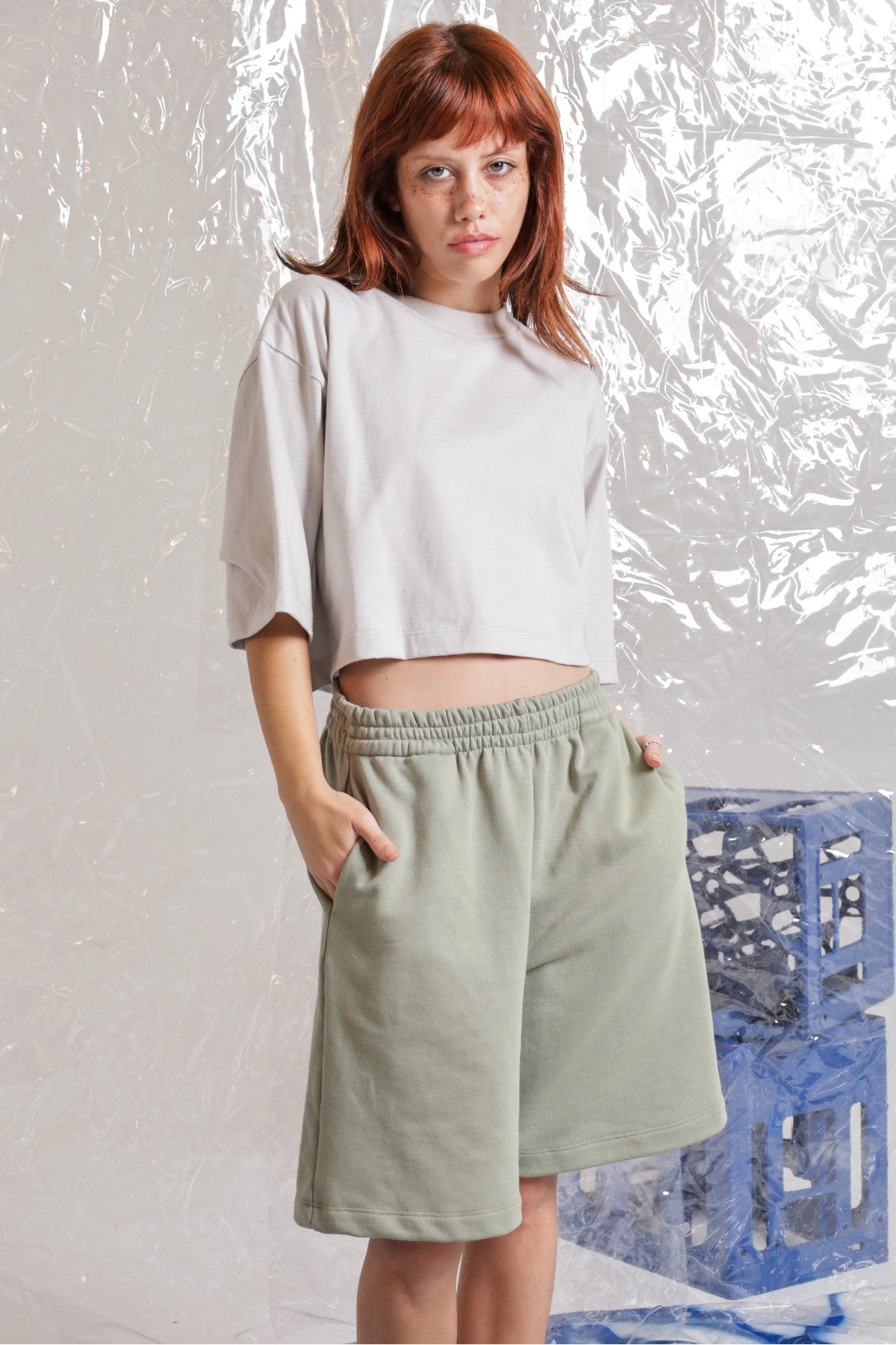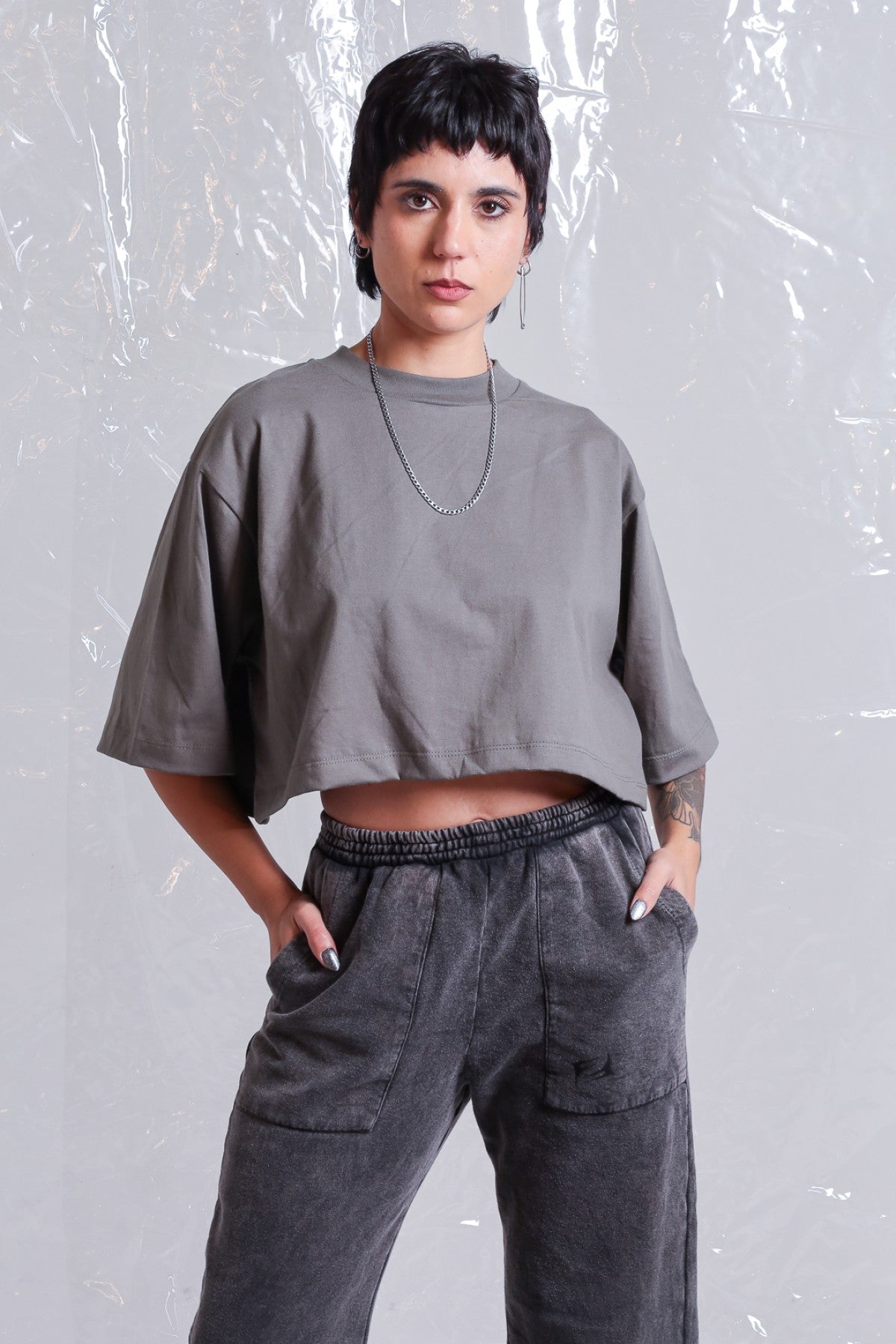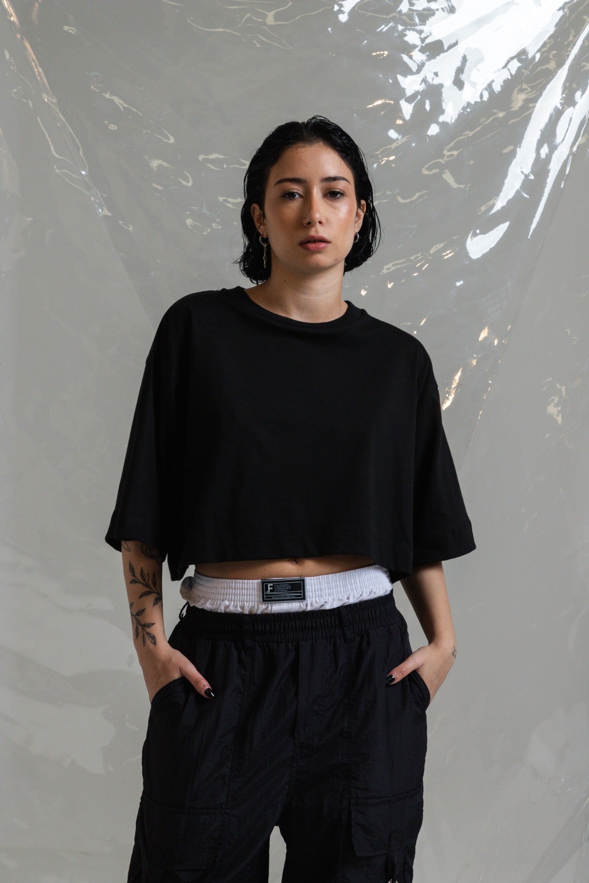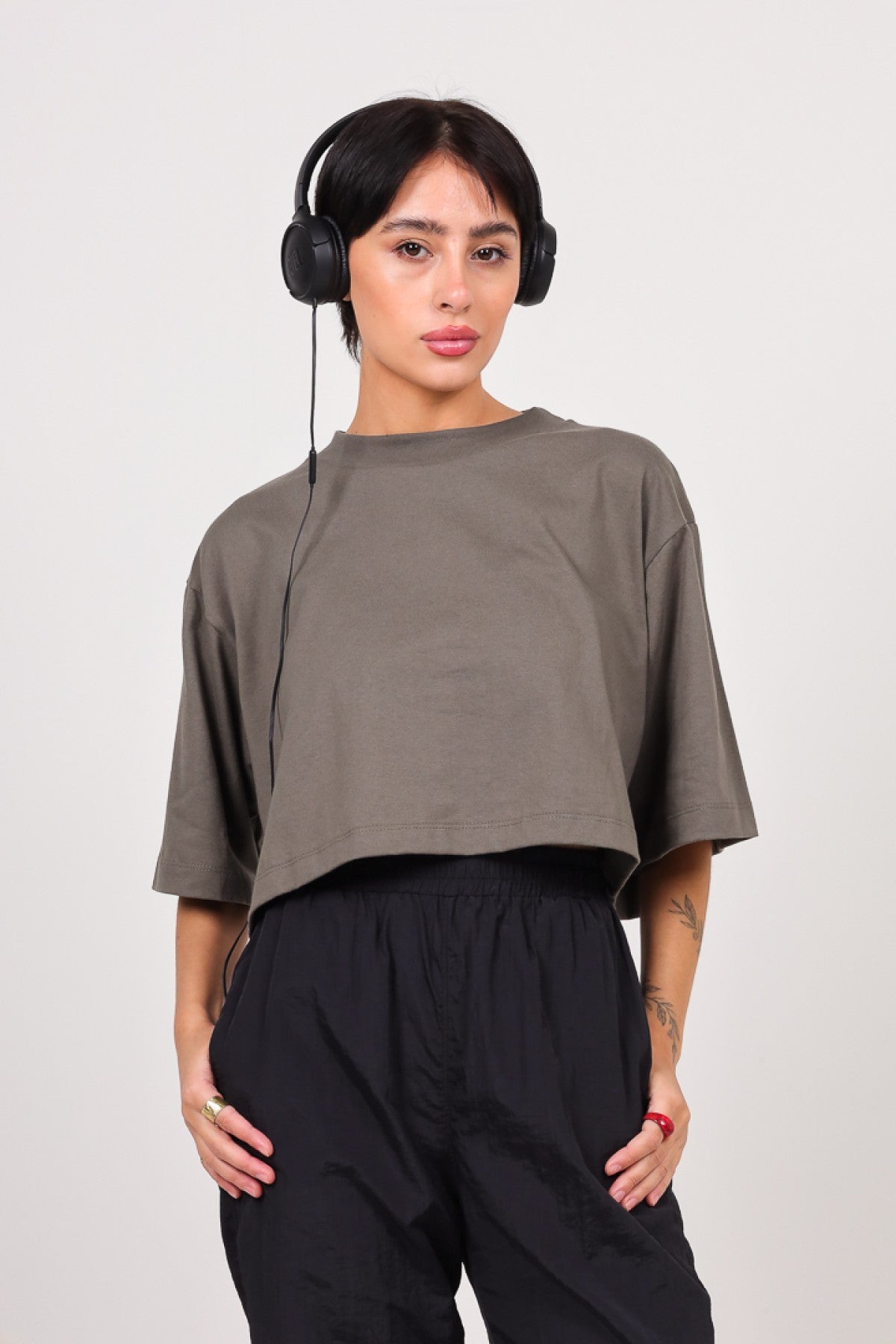 Remera lisa de jersey manga corta con cuello redondo de ribb. Calce Crop. Composición: 100% Algodón