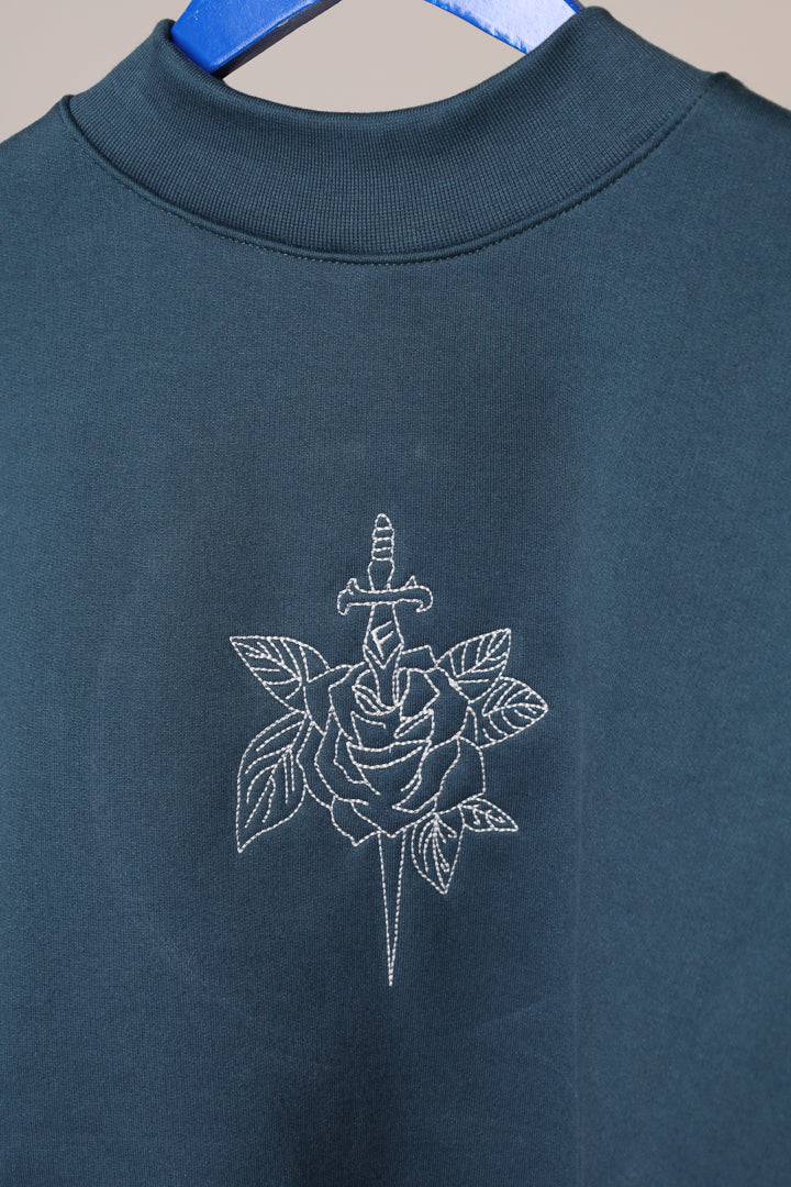 Buzo de frisa cuello redondo ancho y cintura de ribb, con bordado exclusivo.