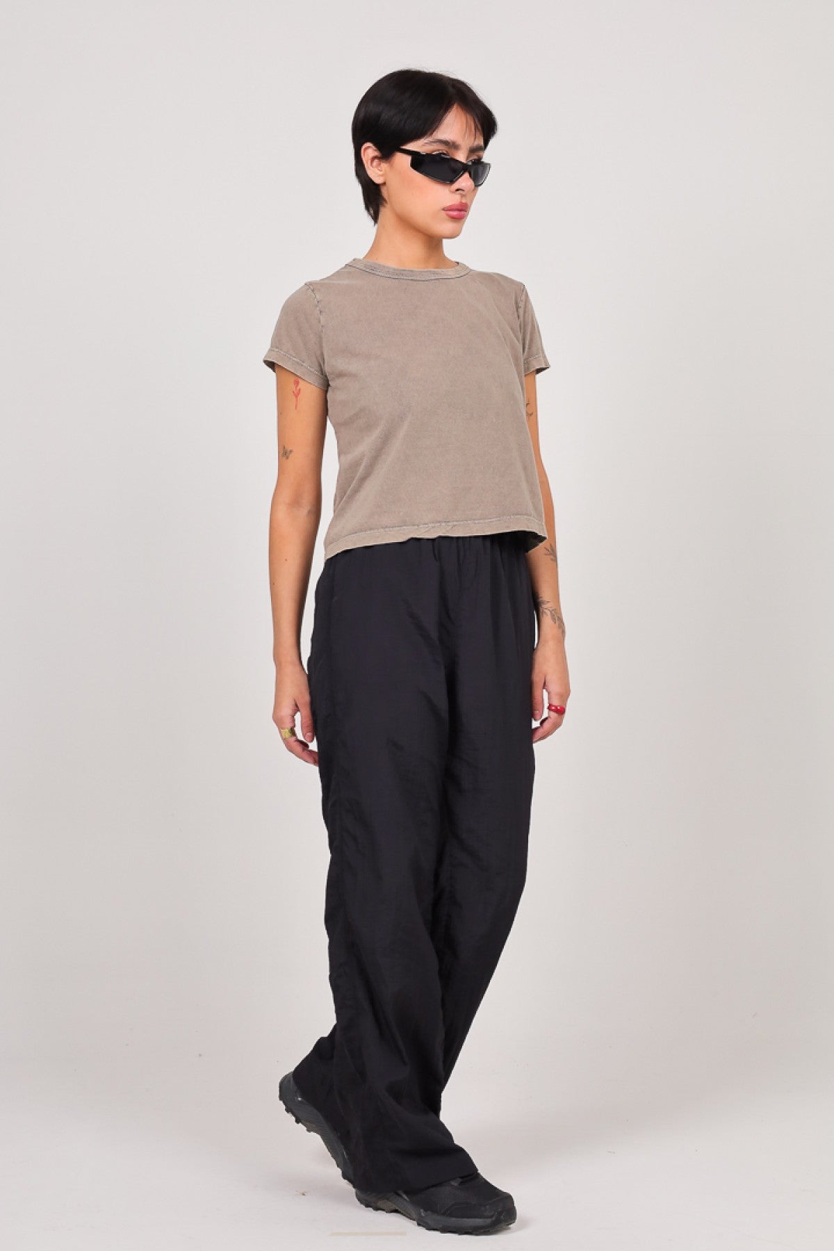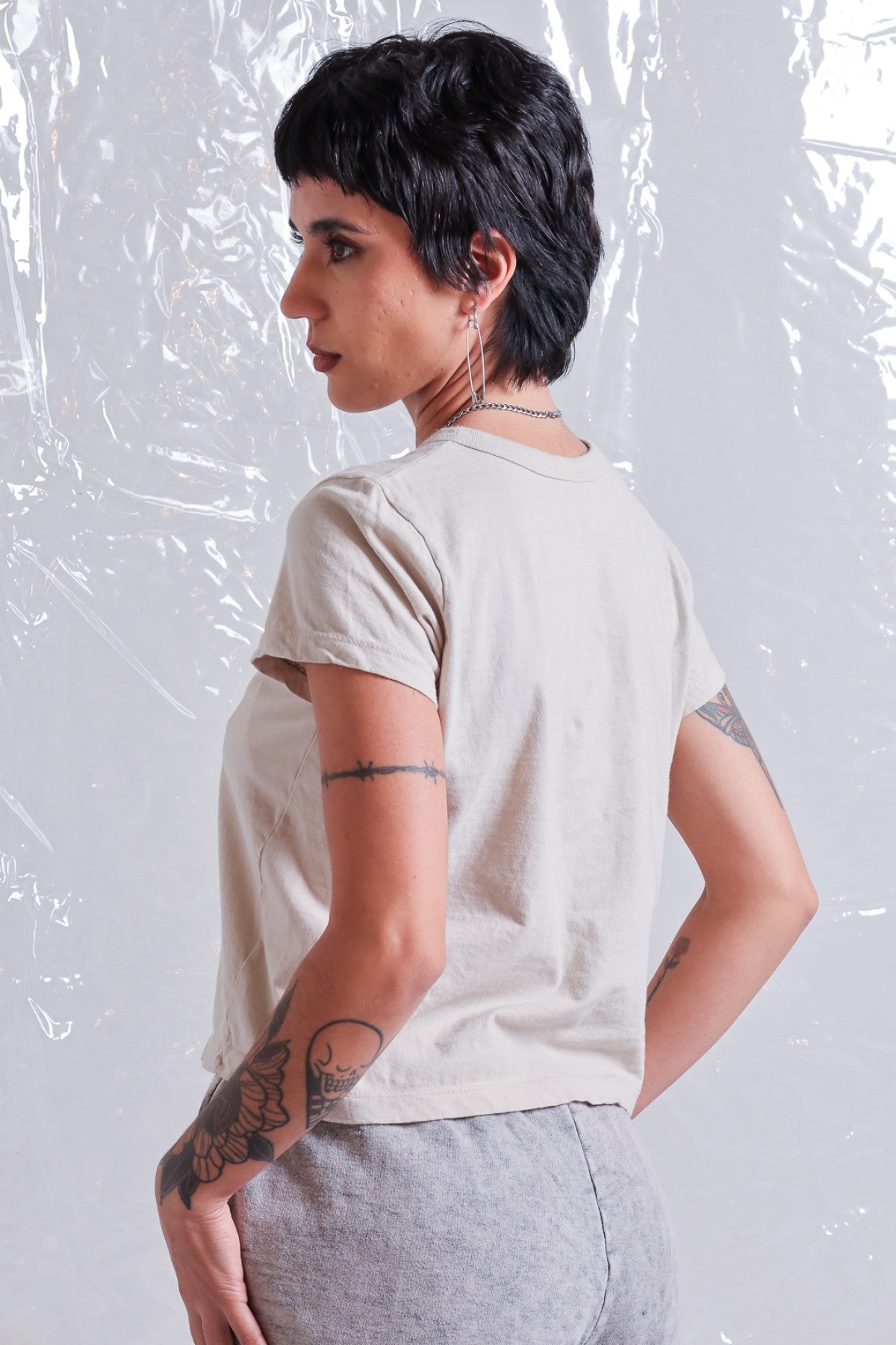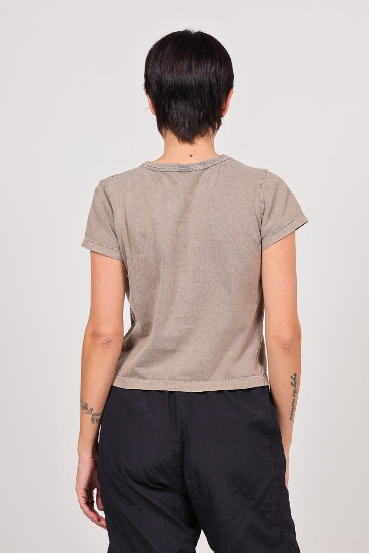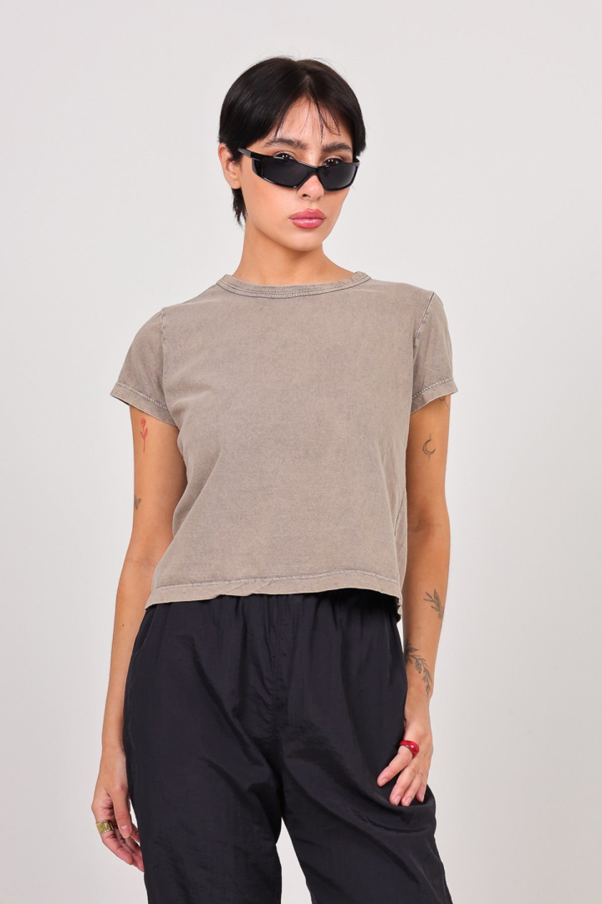 Remera lisa de jersey pesado manga corta con cuello redondo de ribb. Calce Crop. Esta prenda lleva un proceso artesanal de lavado acid, puede variar levemente en cada prenda.
